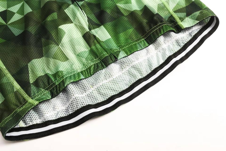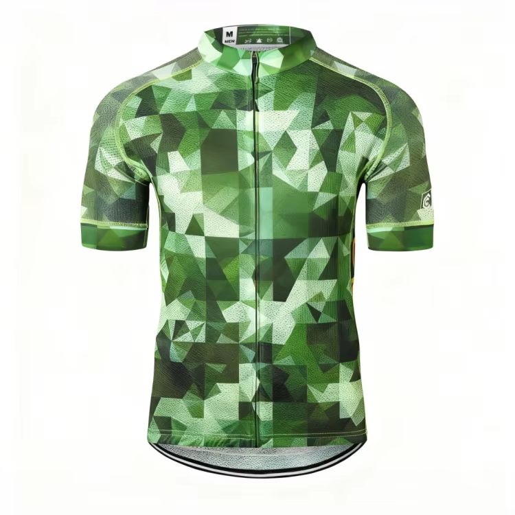 เสื้อปั่นจักรยานแขนสั้นแบบยูนิเซ็กซ์สีเขียวพิมพ์ลายคาโม่ทรงเรขาคณิตระบายอากาศได้ดีแห้งเร็วทรงเข้ารูปเสื้อระดับมืออาชีพสำหรับการปั่นจักรยานบนถนน