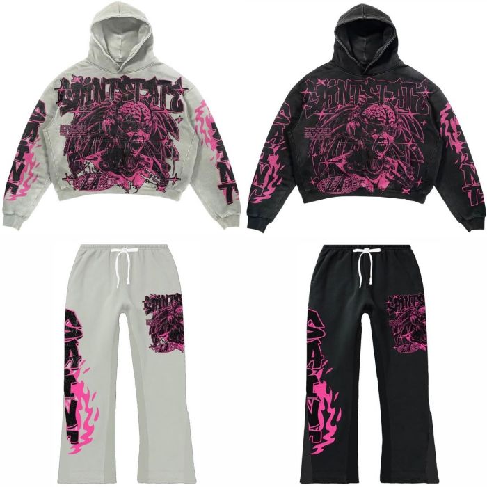 Unisex Stacked Suit Streetwear Tracksuit Pullover Sweatsuits Two Pieces Jogger Flare Pants Sets Baggy Acid Wash Tracksuit Set