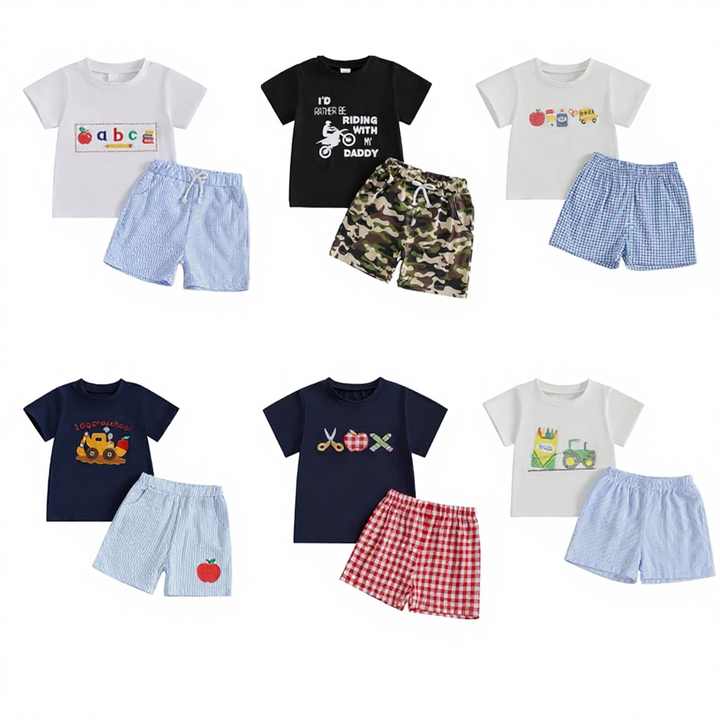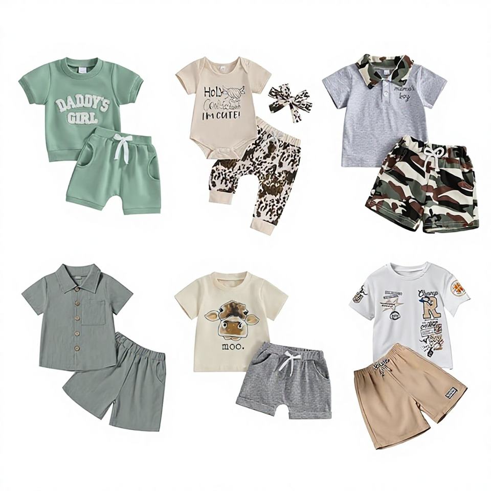 ชุดเสื้อยืดและกางเกงขาสั้นผ้าฝ้ายสำหรับเด็ก 2 ชิ้น ไม่มีแบรนด์ เหมาะสำหรับฤดูร้อน พร้อมระยะเวลาจัดส่งตัวอย่าง 7 วัน และแพ็คแบบคละ
