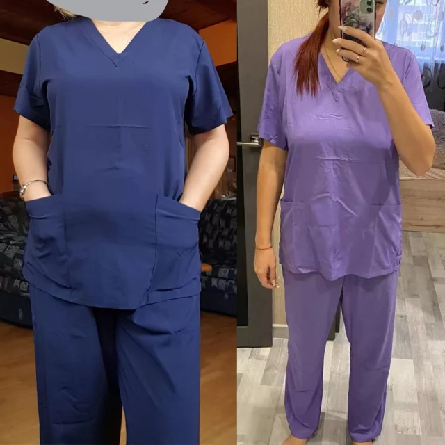 ชุดยูนิฟอร์มพยาบาลฤดูร้อนแบบ unisex ชุดสครับแขนสั้นแบบแยกชิ้น กางเกงขาสั้น ชุดสครับแขนยาว ผ้าทวิล รับสกรีนโลโก้ สำหรับโรงพยาบาลหลายแห่ง