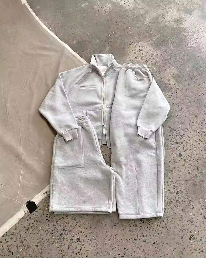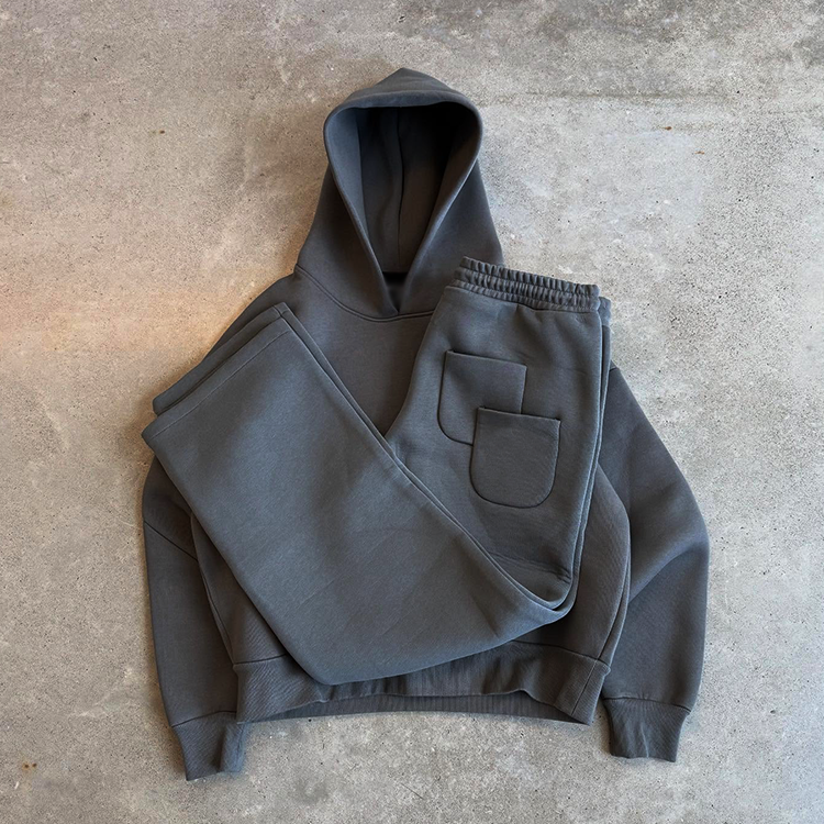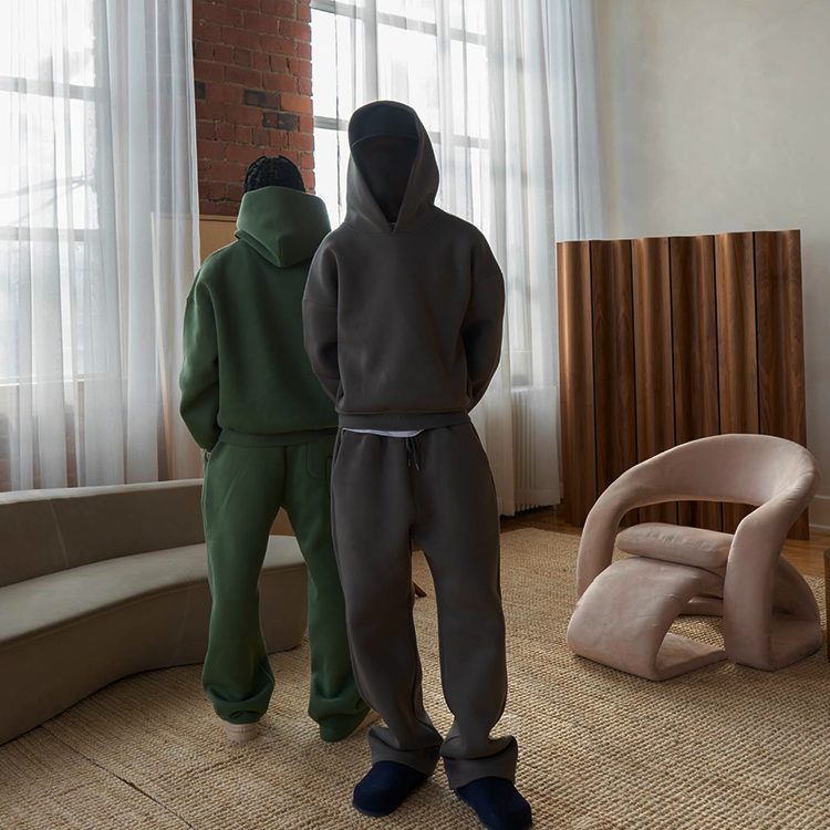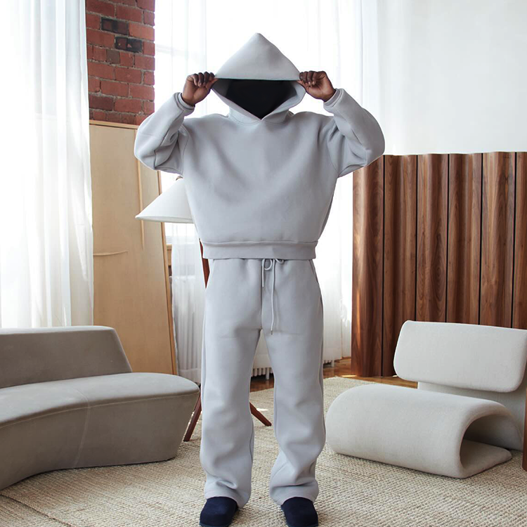 ชุดวอร์มใส่ได้ทั้งชายและหญิงนีโอพรีนแบบสวมหัวเสื้อสเวตเตอร์ไม่มีลายเรียบๆทรงหลวมมีฮู้ดและกางเกงขายาวชุดสูทกันเหงื่อสำหรับผู้ชาย