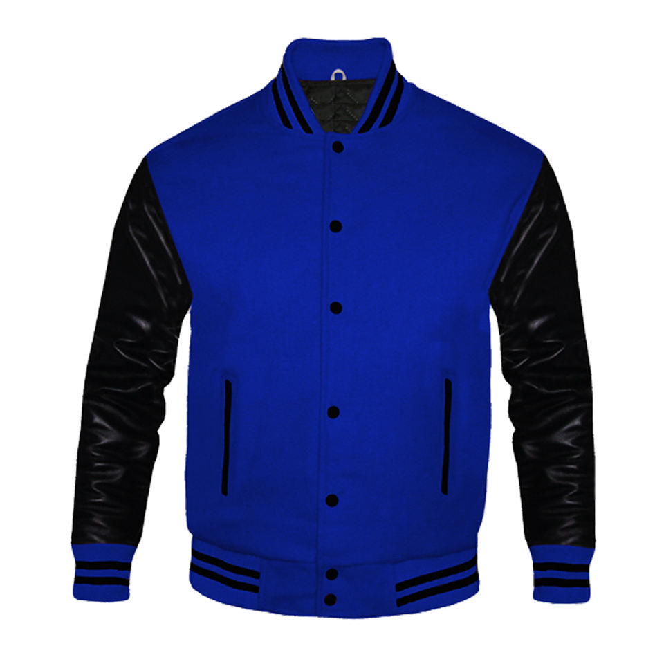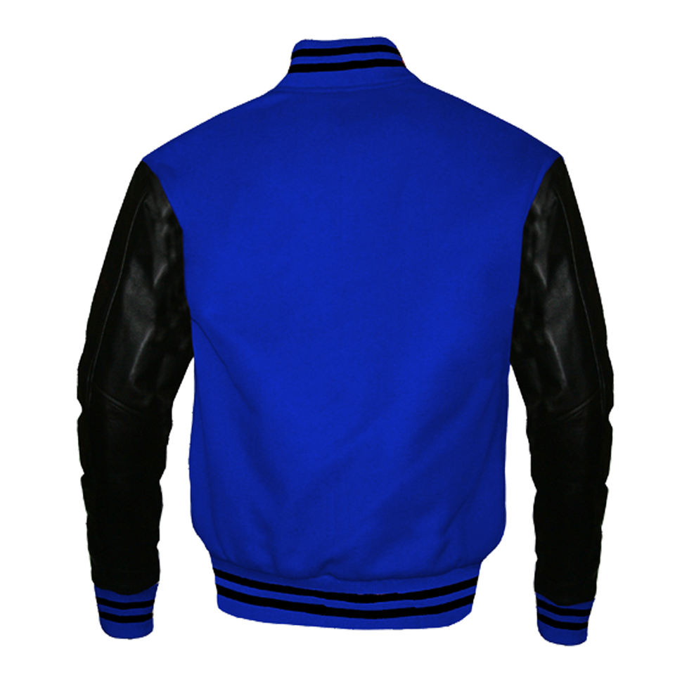 เสื้อแจ็คเก็ตเบสบอลแบบวาร์ซิตี้สีน้ำเงินสำหรับทุกเพศ ทำจากผ้าขนสัตว์ผสมผ้าฝ้าย แบบ Letterman สำหรับเด็กนักเรียนชาย