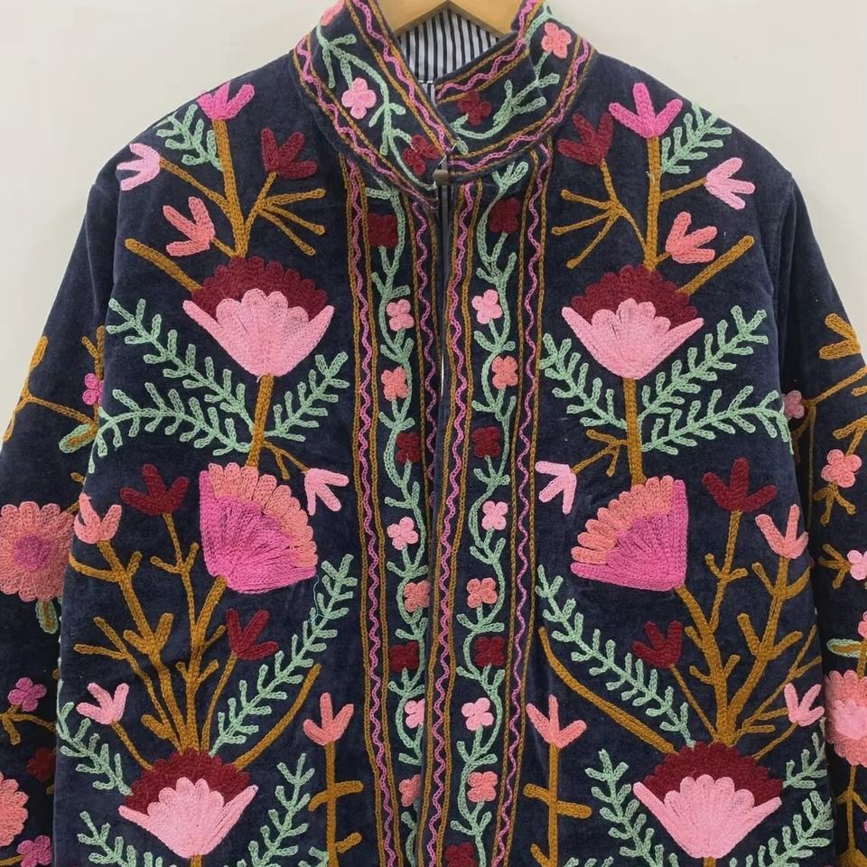 Suzani แจ็กเก็ตฤดูหนาวสไตล์วินเทจโบโฮปักลายดอกไม้กำมะหยี่เก๋ไก๋เสื้อนอกสไตล์ชนเผ่าที่มีไส้ผ้าฝ้ายถัก