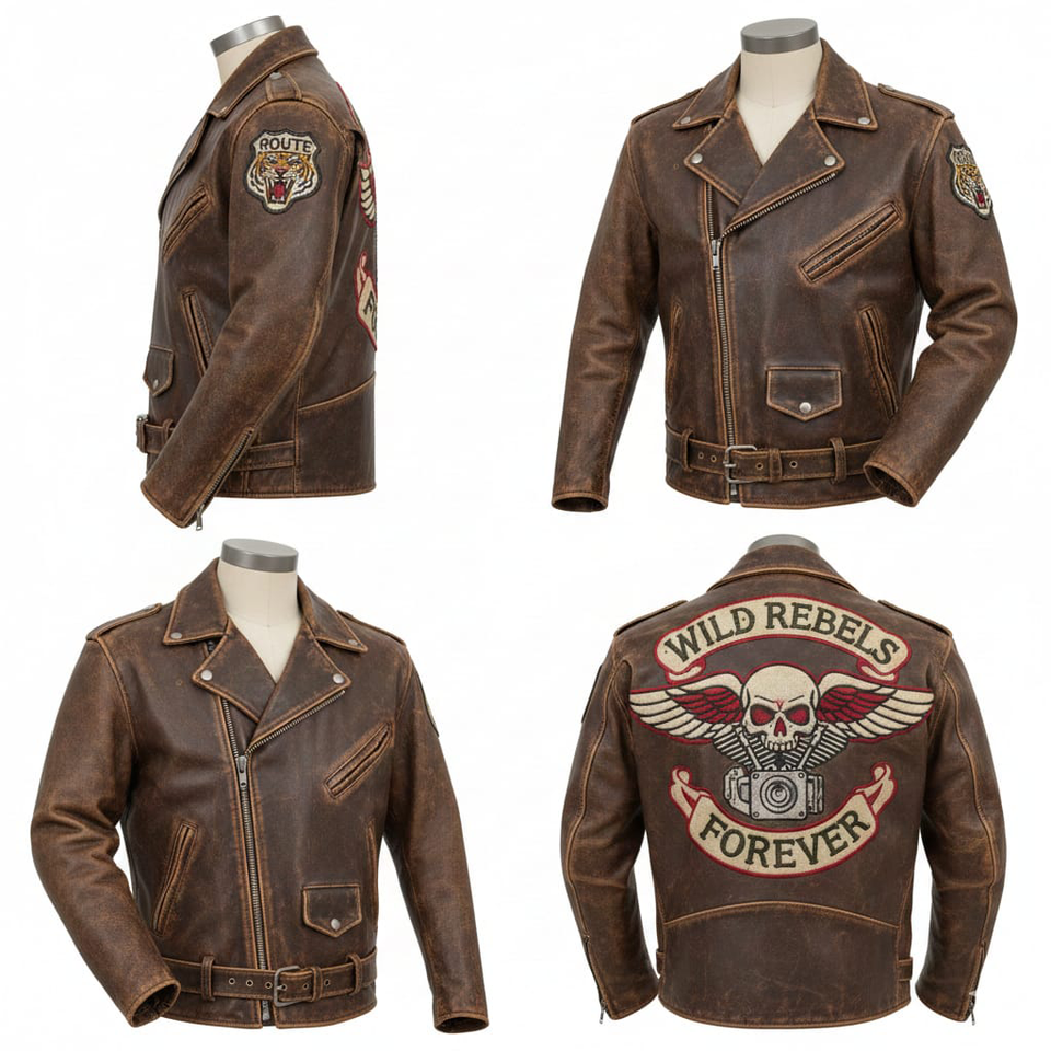 แจ็คเก็ตหนังแท้สไตล์วินเทจสำหรับทุกเพศ ตกแต่งลายปักกะโหลกแบบ Wild Rebels ทรงสลิมฟิต ด้านหน้าผ้าแคนวาสสไตล์พังก์