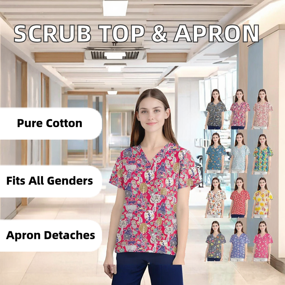 เสื้อสครับแบบทอผ้าฝ้าย 100% สำหรับทุกเพศ พร้อมผ้ากันเปื้อนแบบถอดได้ สำหรับพยาบาลและบุคลากรทางทันตกรรมในสภาพแวดล้อมการทำงานที่มีความวุ่นวาย