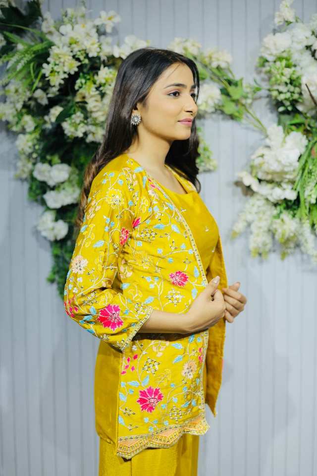 ชุดเสื้อครอปแจ็คเก็ตปักลายสีเหลืองมัสตาร์ดพรีเมียมยูนิตี้ ลักซ์เชอร์ พร้อมกางเกงทรงพาลาซโซ ชุดหรูหราสำหรับงานเทศกาล
