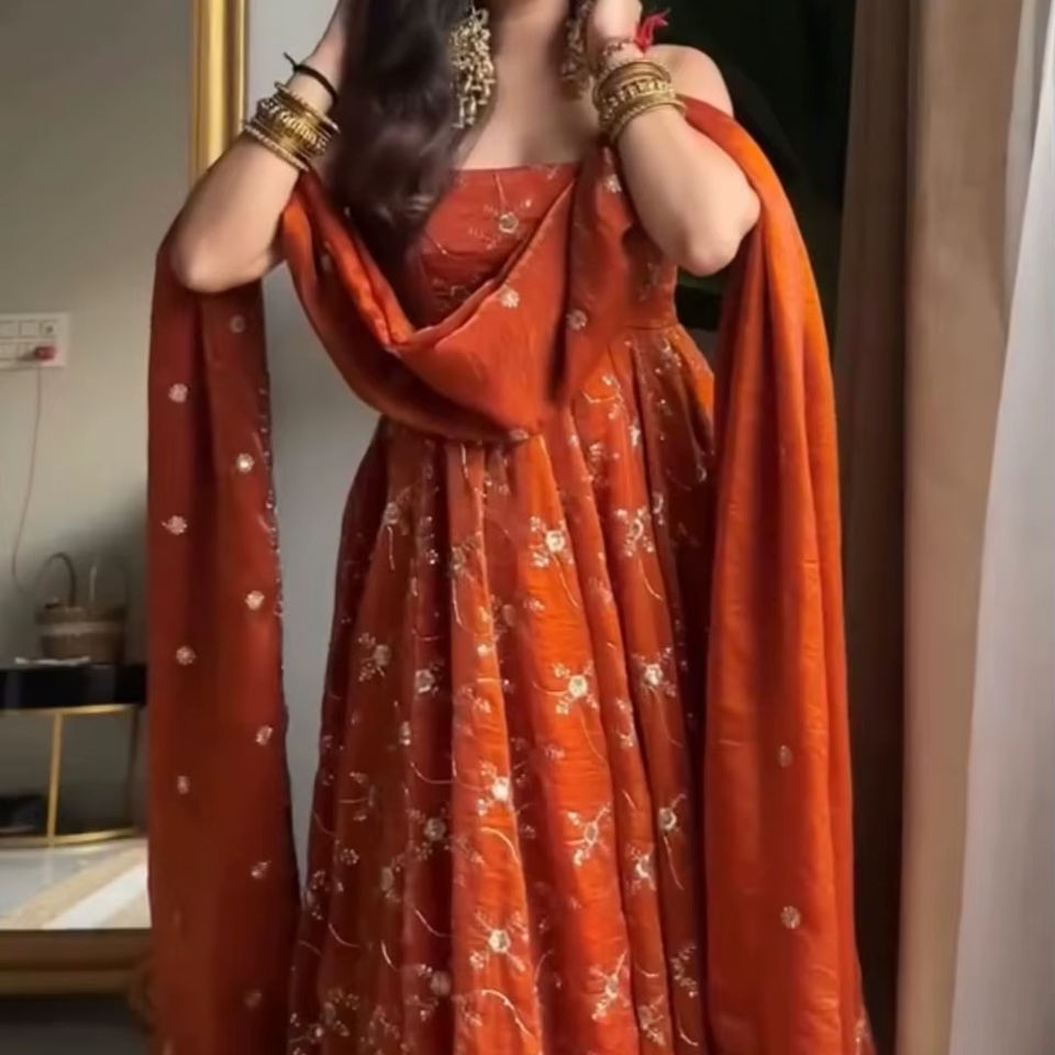 ชุดคุร์ตาอานาร์กาลีแขนกุดผ้าเรยอนปักลายสำหรับผู้หญิง Unity Luxure พร้อมผ้าคลุมไหล่เข้าชุด ระบายอากาศได้ดี สง่างาม เหมาะสำหรับงานเทศกาล ชุดพื้นเมือง