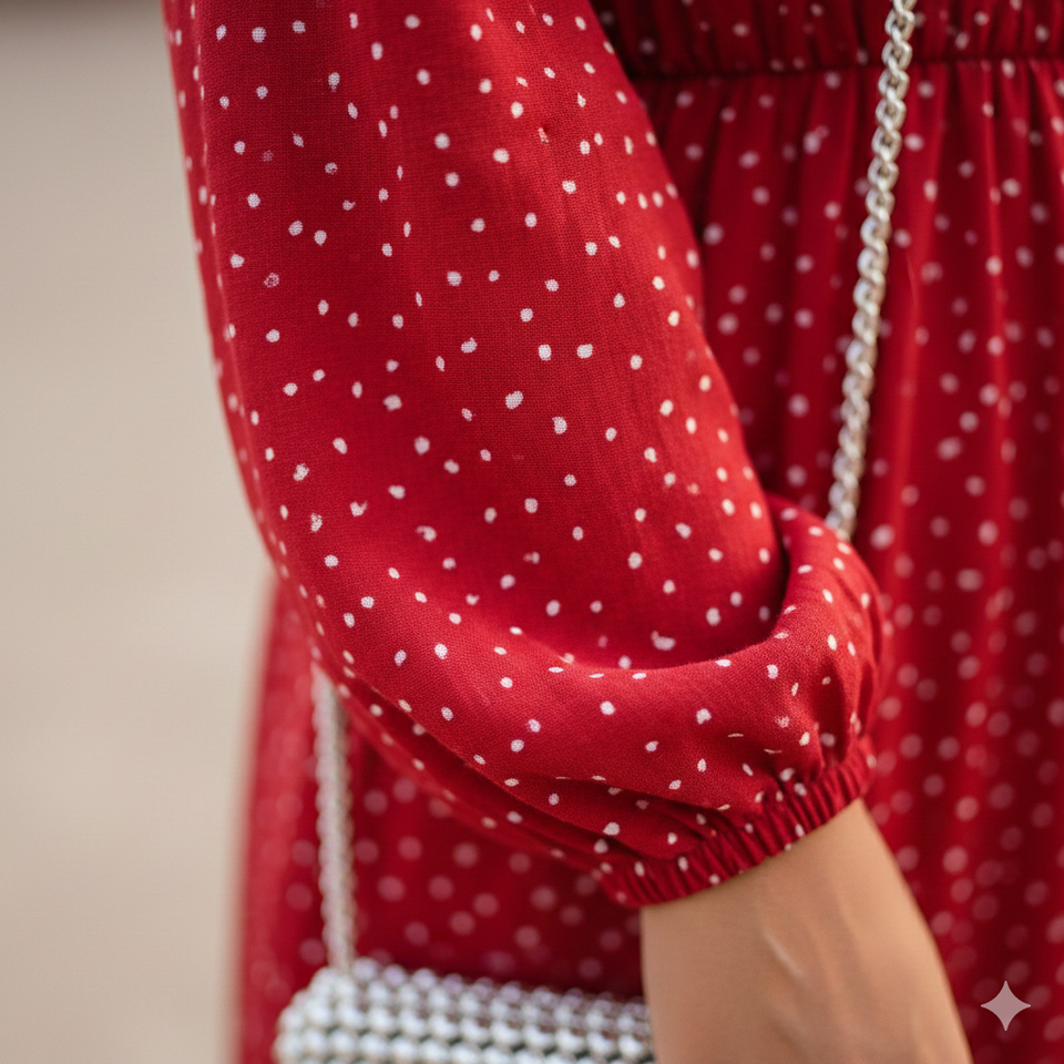 ชุดเดรสยาวลายจุดสีแดงผ้าเรยอนเครปพรีเมียมสำหรับผู้หญิง Unity Luxure แขนยาว คอวี ทรงบาน สวมใส่สบายๆ และเหมาะสำหรับวันหยุด