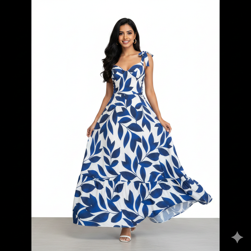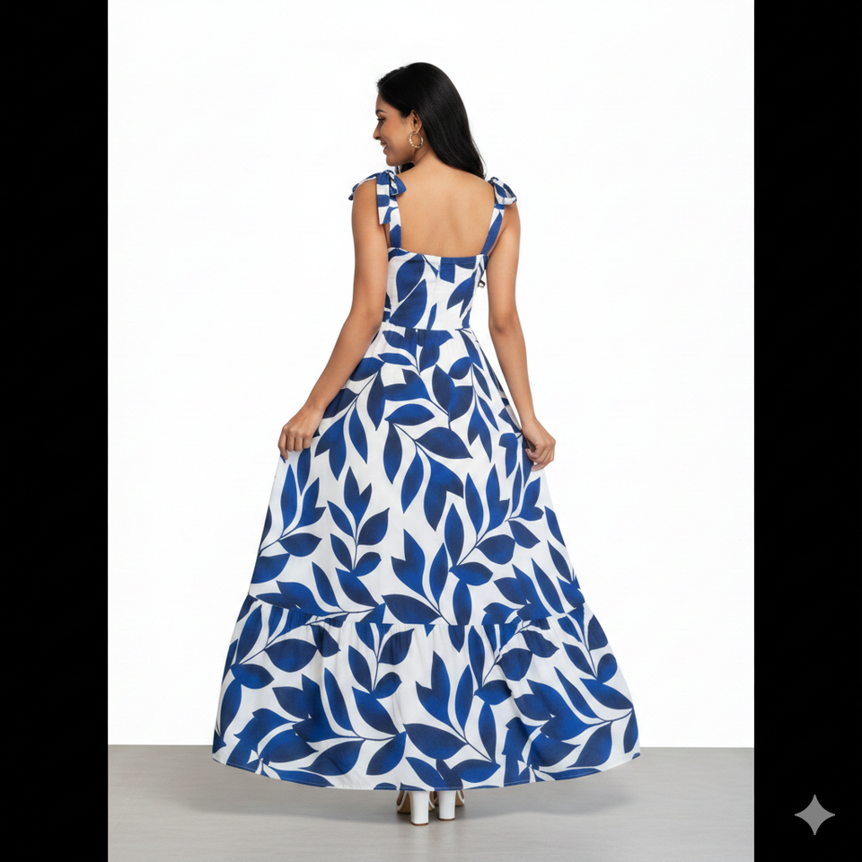 ชุดเดรสแม็กซี่ลายใบไม้ผ้าจอร์เจต์เนื้อนุ่มระดับพรีเมียมสำหรับผู้หญิงยูนิตี้ ลักชัวร์ พร้อมสายคล้องไหล่แบบผูก