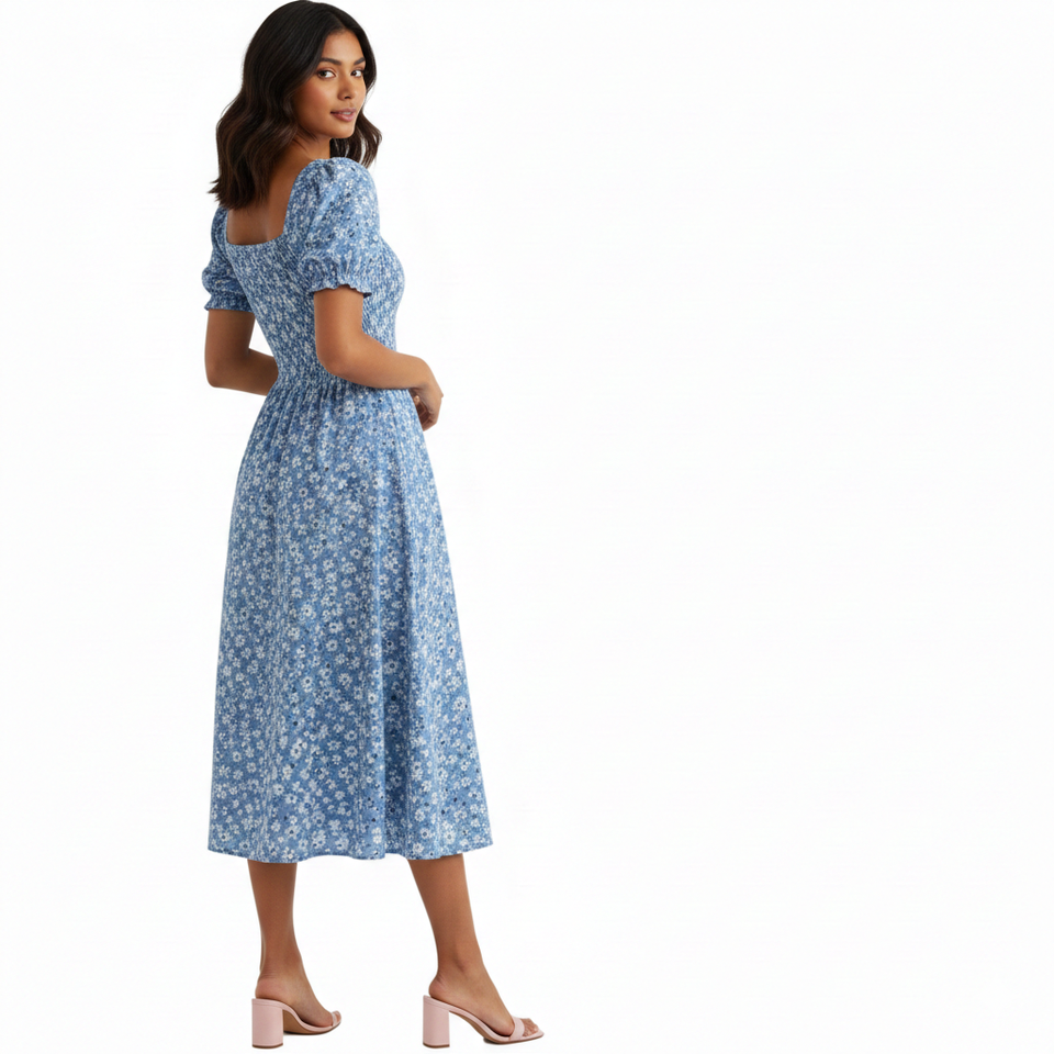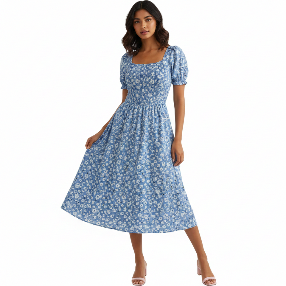 ชุดเดรสยาวฤดูร้อนสำหรับผู้หญิง Unity Luxure สีเขียวลายดอกไม้ระบายพิมพ์ลายจุด ดีไซน์ลำลองหรูหรา แขนสั้นพองด้านหน้า