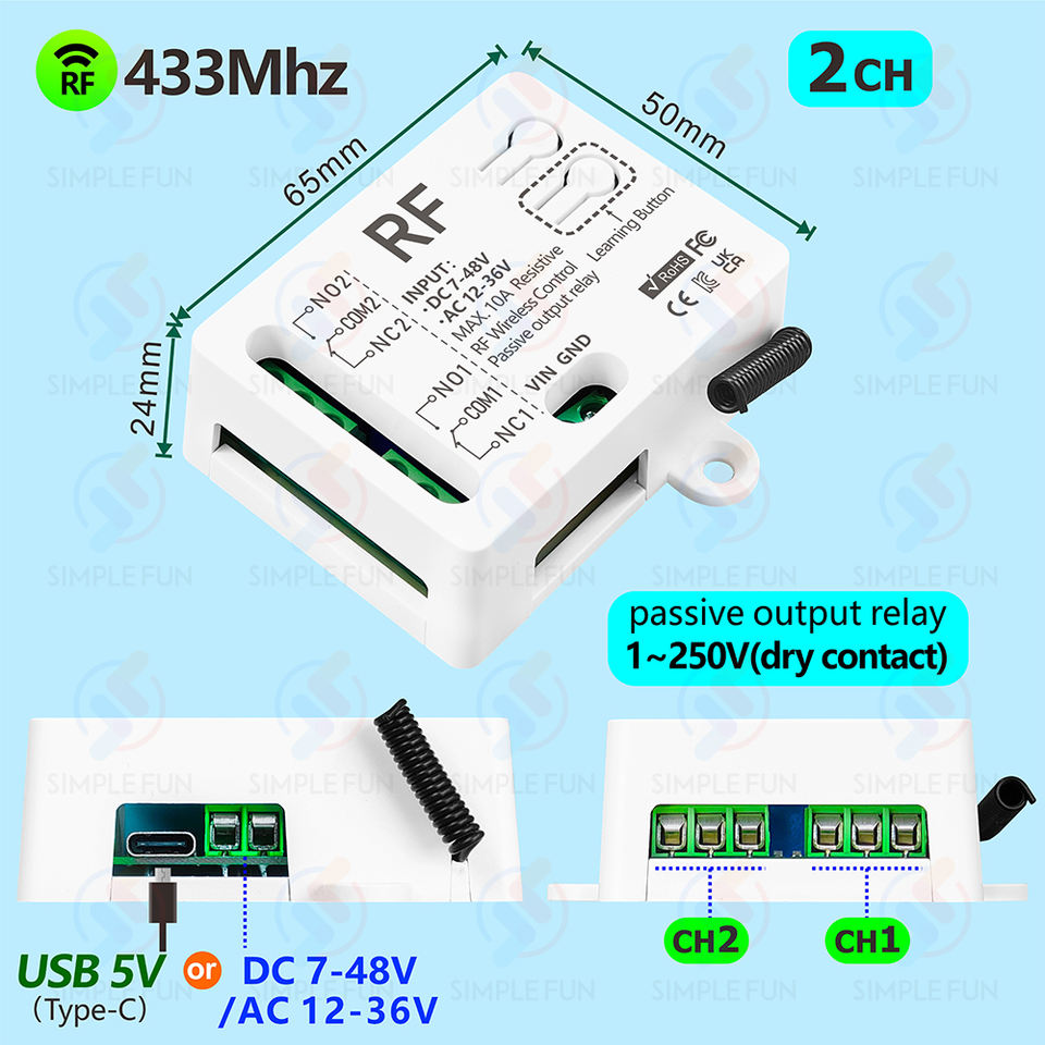 รีโมทคอนโทรลไร้สายแบบสากล433MHz 2 CH Type-C 5V DC 12V 24V 36V 48V โมดูลรีเลย์สำหรับ LED/พัดลม/มอเตอร์/โรงรถประตูฯลฯ