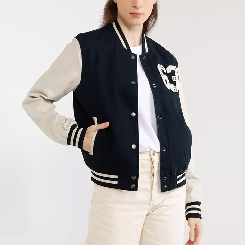 เสื้อแจ็กเก็ตเบสบอลของมหาวิทยาลัยสำหรับผู้หญิงเสื้อแจ็กเก็ตเลตเทอร์แมนแบบสั่งทำสำหรับผู้หญิงแจ็คเก็ตสตรีแบบไม่มีลาย