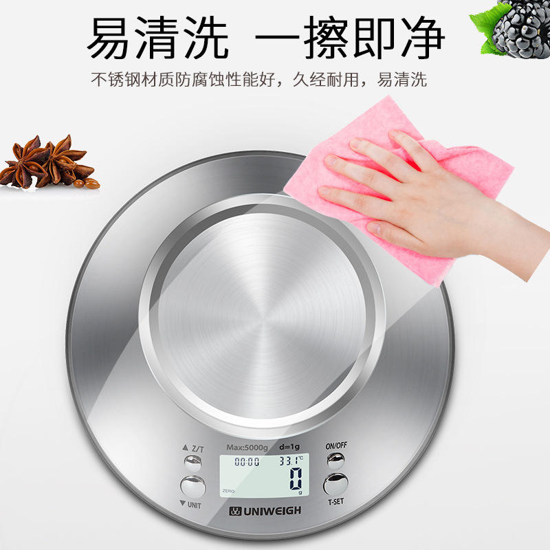ยูนิเวห์เครื่องชั่งดิจิตอลในครัว 5000 กรัม ความแม่นยำ 1 กรัม ชามสแตนเลส ระบบปิดอัตโนมัติ ใช้พลังงานจากแบตเตอรี่ รูปทรงกลม