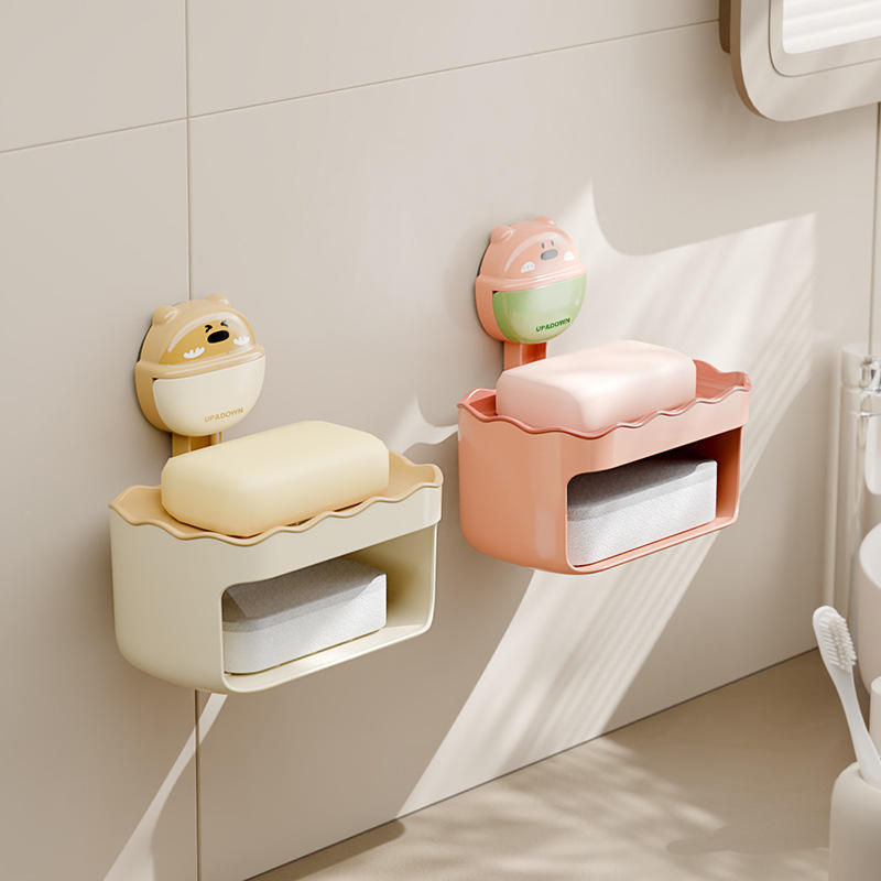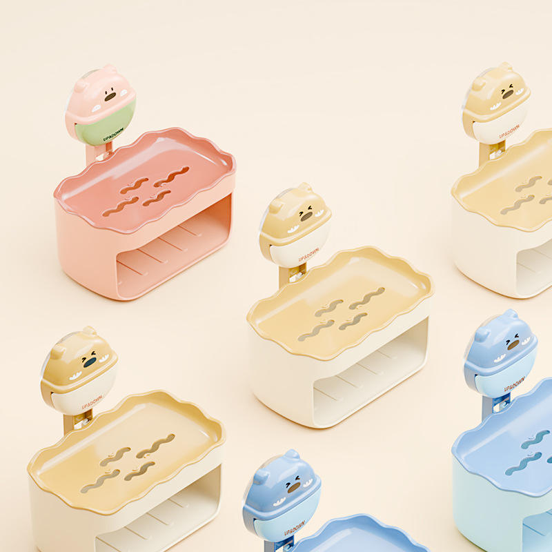 ที่วางสบู่ติดผนังรูปการ์ตูนแบบยกขึ้นลงได้ สีชมพู ทำจากพลาสติก พร้อมที่ระบายน้ำในตัว สำหรับจัดระเบียบห้องน้ำ พร้อมที่วางฟองน้ำ