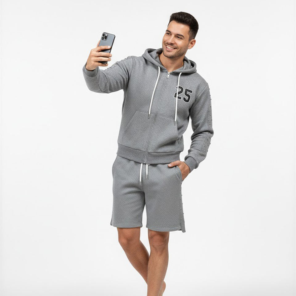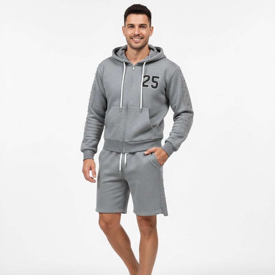เสื้อฮู้ดดี้และกางเกงขาสั้นพิมพ์โลโก้ตามสั่ง ตกแต่งด้วยคริสตัล ผ้าฟลีซคอตตอน 100% สำหรับแฟชั่น