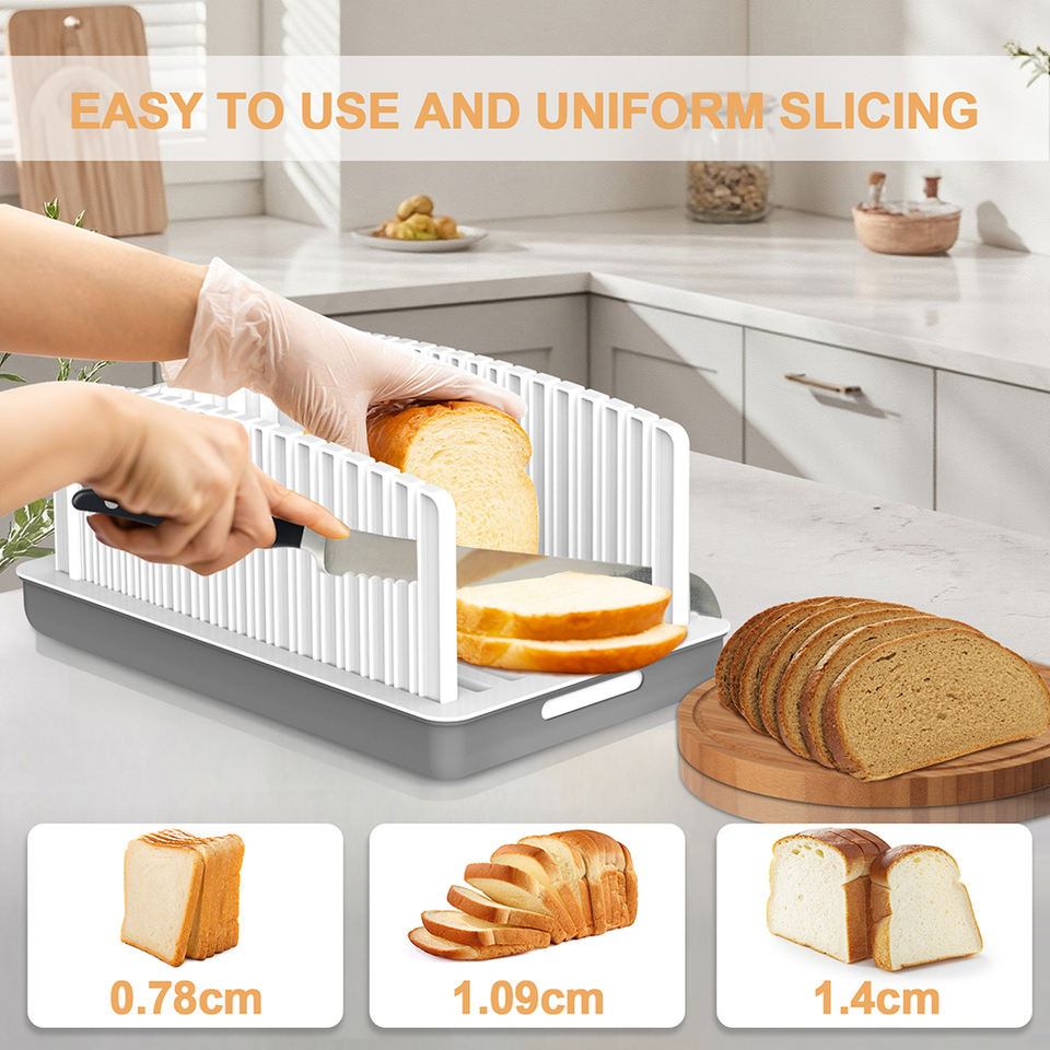 เครื่องตัดขนมปังแบบปรับระดับได้สำหรับทำขนมปังโฮมเมด ปรับความกว้างและความหนาได้ พับเก็บได้ ขนาดกะทัดรัด พร้อมถาดรองเศษขนมปัง