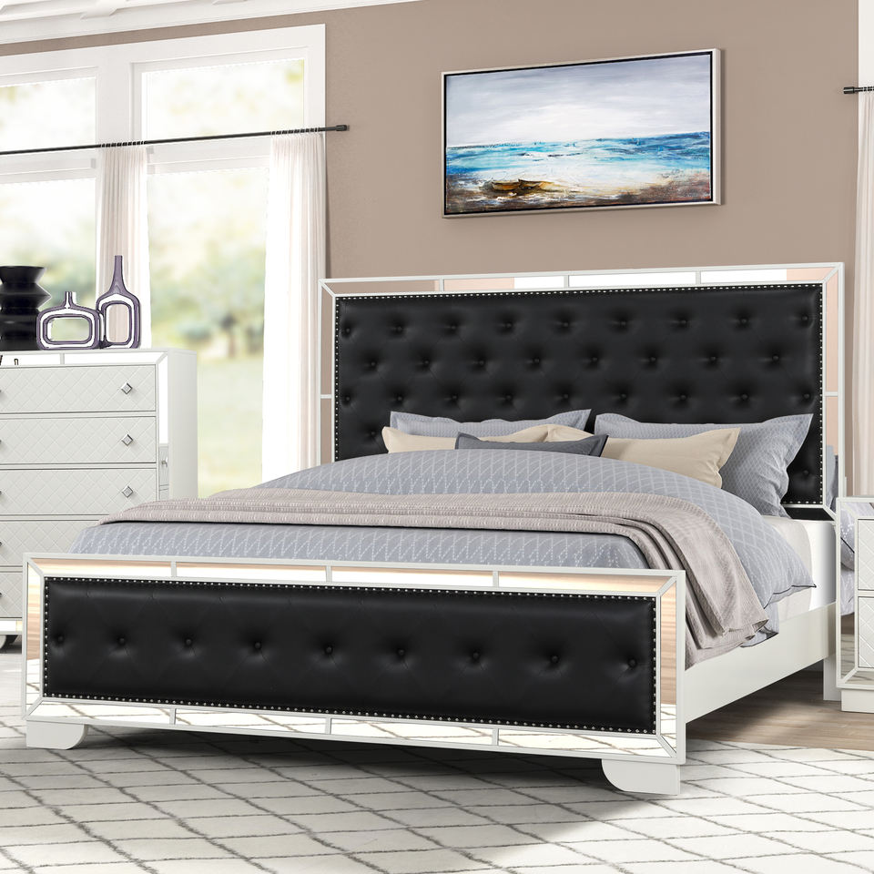 ชุดเฟอร์นิเจอร์ห้องนอนสีขาวแกะสลักหรูหรา ประกอบด้วยเตียงหุ้มเบาะ ตู้เสื้อผ้า โต๊ะข้างเตียง และตู้ลิ้นชัก