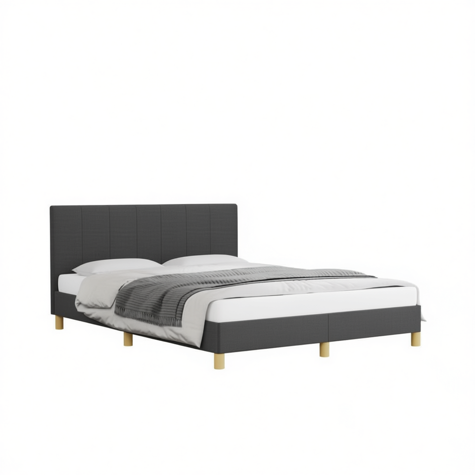โครงเตียงหุ้มผ้าพร้อมหัวเตียง ผ้าสีเทาเข้ม ดีไซน์เรียบง่ายทันสมัย ขาไม้ ขนาดควีนไซส์