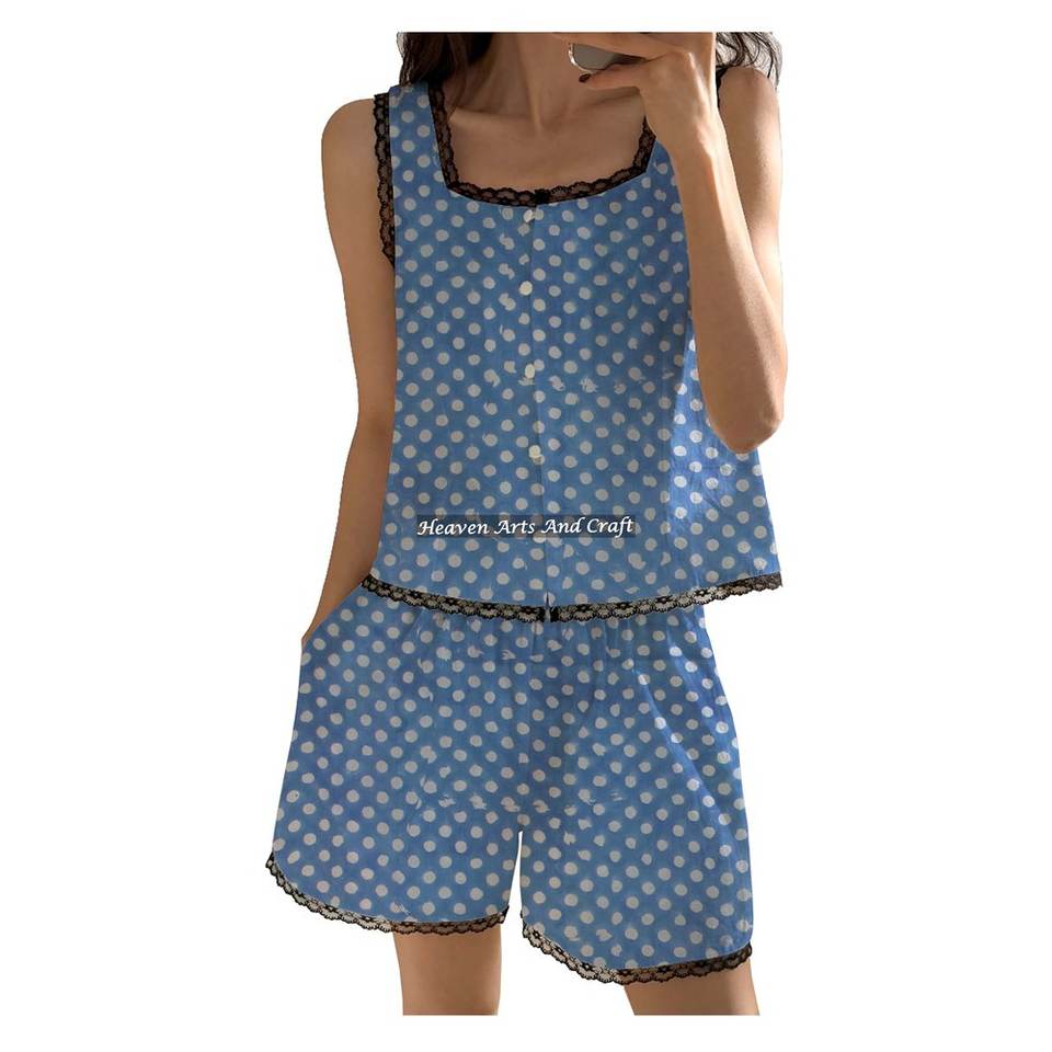 ชุดนอนผ้าฝ้ายสไตล์โบฮีเมียนสำหรับผู้หญิง ลายดอกไม้ แขนกุด ตกแต่งด้วยลูกไม้ ชุดเซ็ตเสื้อและกางเกงขาสั้น สำหรับฤดูใบไม้ผลิ/ฤดูร้อน ลายพิมพ์บล็อก