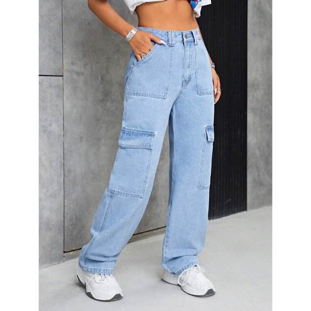 Fit Type: Multipocket Denim Cargo Jeans, Waist Type: High Waist., Fabric: Stretch Denim (Cotton + Stretch Denim)., Length: Full Length (Approx. 40 inches)., Closure Type: Zipper Fly with Metal Button., Pattern Type: Solid / Plain., Pocket Type: 6-Pocket Classic Design., Stitching: Double-Needle Durable Stitch., Details: Clean Look / Minimalist Finish / Premium Thread Work., Fabric Features: Breathable., Wash Type: Enzyme Wash / Soft Finish., Usage: Casual Wear.