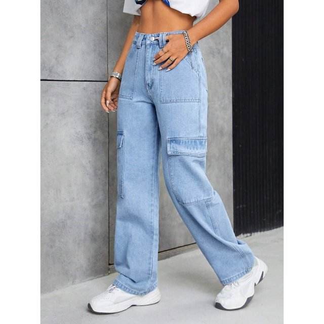 กางเกงยีนส์เดนิมยืดทรงคาร์โก้สีน้ำเงิน Urban Ice Blue สไตล์ Y2K ทรงสูง ทนทาน เป็นมิตรกับสิ่งแวดล้อม หรูหรา หลายกระเป๋า ทรงปกติ เหมาะสำหรับใส่เดินเล่นในเมือง