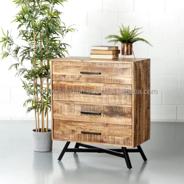 ตู้บาร์ไม้สไตล์ลอฟท์พร้อมฐานโลหะอุตสาหกรรม ตกแต่งลายไม้โอ๊คแบบเรียบง่าย ตู้เก็บเครื่องดื่ม - แบบ 4 ลิ้นชัก