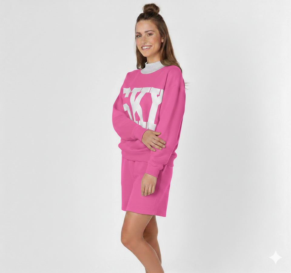 ชุดเซ็ตสองชิ้นสำหรับผู้หญิง Urban Relax เสื้อคอเต่าสีชมพูพื้นสำหรับฤดูหนาว พร้อมเสื้อตัวบนทรงปกติและกางเกงขาสั้นเหนือเข่า