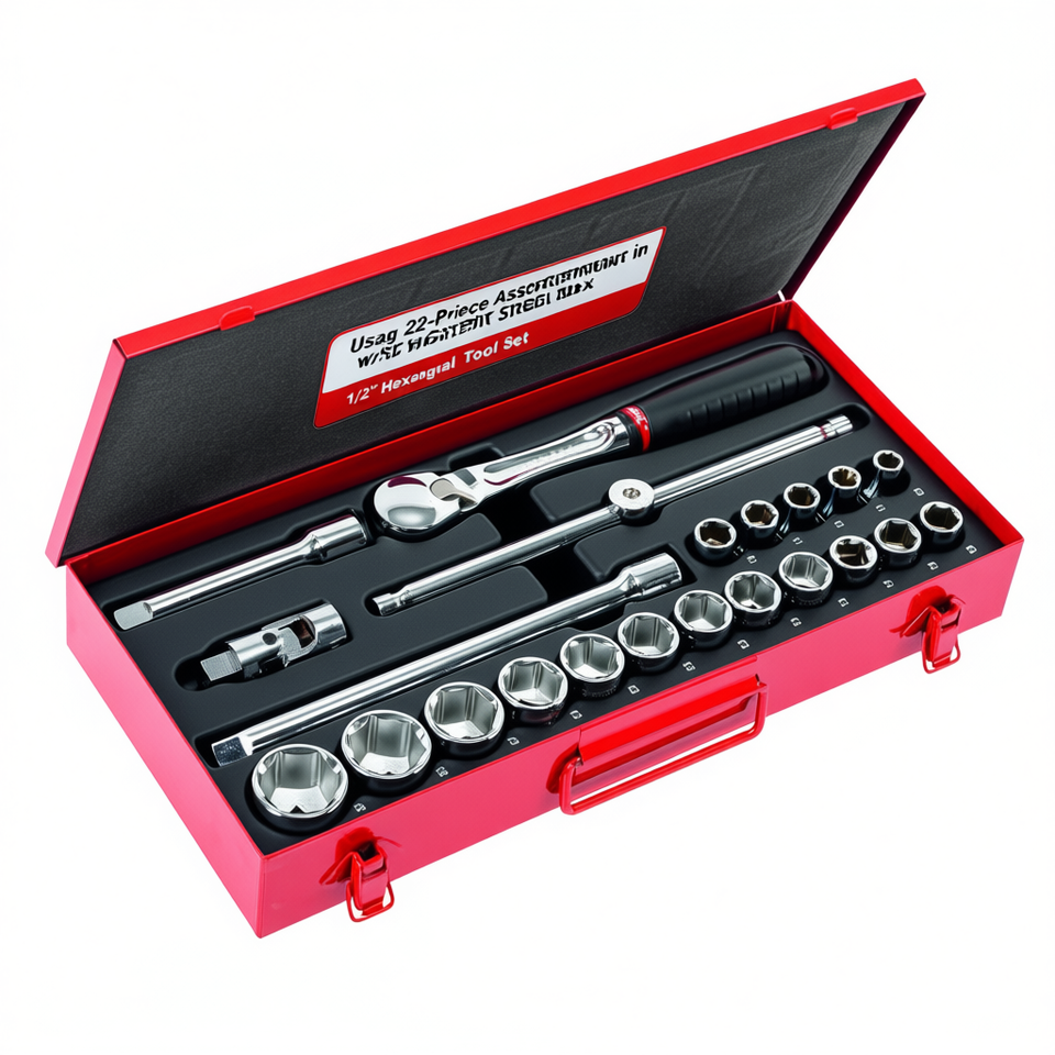 ชุดเครื่องมืออุปกรณ์ช่าง 22 ชิ้น แบบคละชนิด ในกล่องเหล็กแผ่น พร้อมหัวบล็อกหกเหลี่ยมขนาด 1/2 นิ้ว