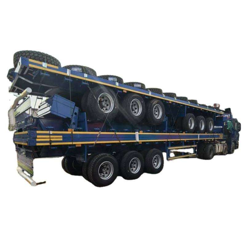 รถพ่วงพื้นเรียบเหล็ก 3 เพลา บรรทุกได้ 5 ตัน ยาว 12.5 เมตร สำหรับขนส่งตู้คอนเทนเนอร์ขนาด 20 ฟุต 40 ฟุต