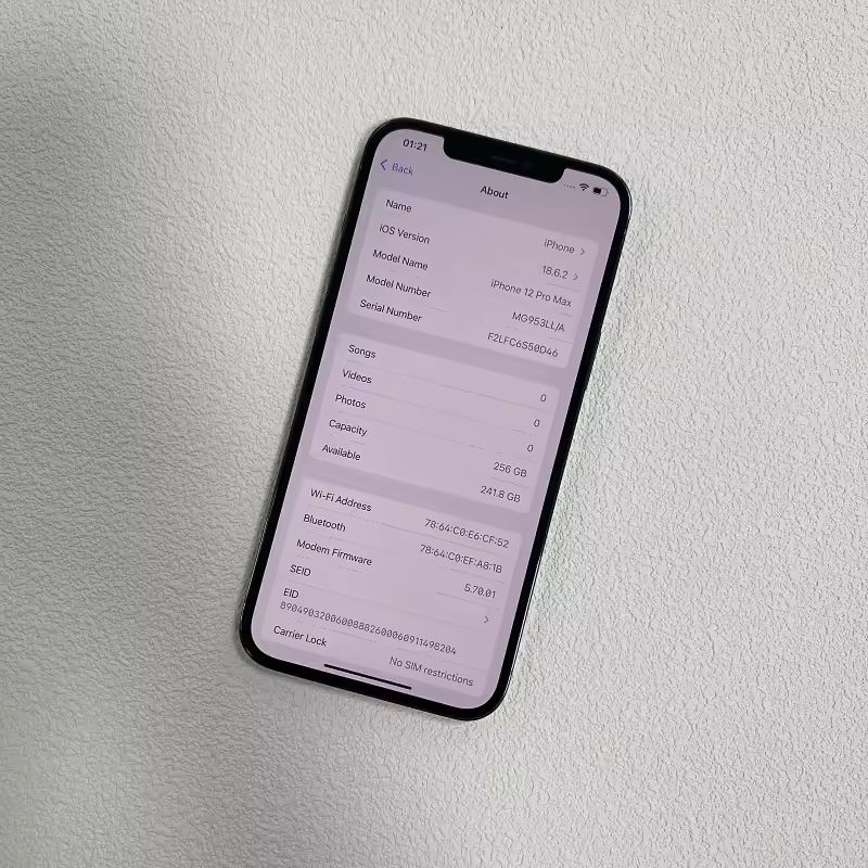 iPhone 12 Pro Max มือสอง ความจุ 256GB แรม 6GB รองรับ 5G หน้าจอ 6.7 นิ้ว รุ่น US พร้อมอุปกรณ์เสริมแท้ สภาพแบตเตอรี่ดีเยี่ยม กล่องสีเดิม