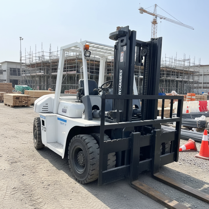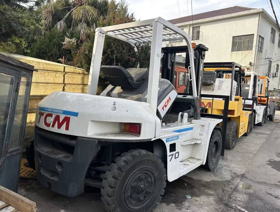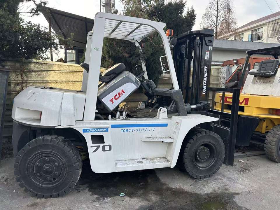 รถยก TCM มือสอง 70 รุ่นญี่ปุ่น 7 ตัน เครื่องยนต์ดีเซล ความยาวงา 1800 มม. ความกว้างงา 1200/15000 มม. ความสูงยก 3000 มม. รับประกัน 2 ปี
