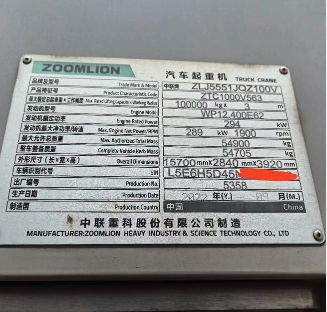 รถเครนบรรทุก ZOOMLION 100 ตัน รุ่น ZTC1000V5 มือสอง พร้อมเครื่องยนต์ Weichai มอเตอร์ปั๊ม แบริ่ง และชิ้นส่วนหลัก