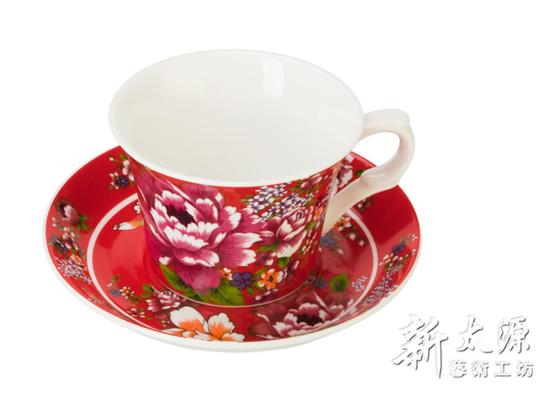 ถ้วยชาสีแดงพิมพ์ลายบนหน้าจอที่มีประโยชน์ถ้วยแก้วลายดอกโบตั๋นถ้วยเซรามิกที่กำหนดเองได้สำหรับชีวิตประจำวัน