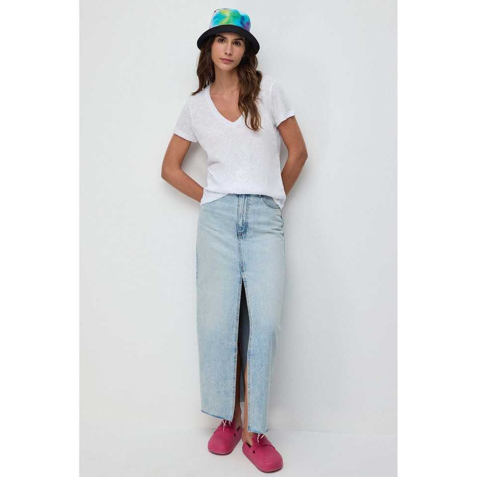 เสื้อยืดคอวีแขนสั้นผ้าลินิน/ผ้าฝ้ายสไตล์ลำลองแบบพื้นฐาน
