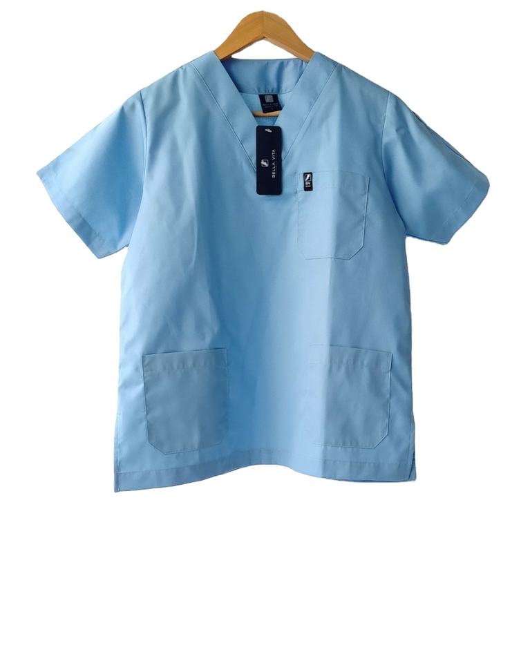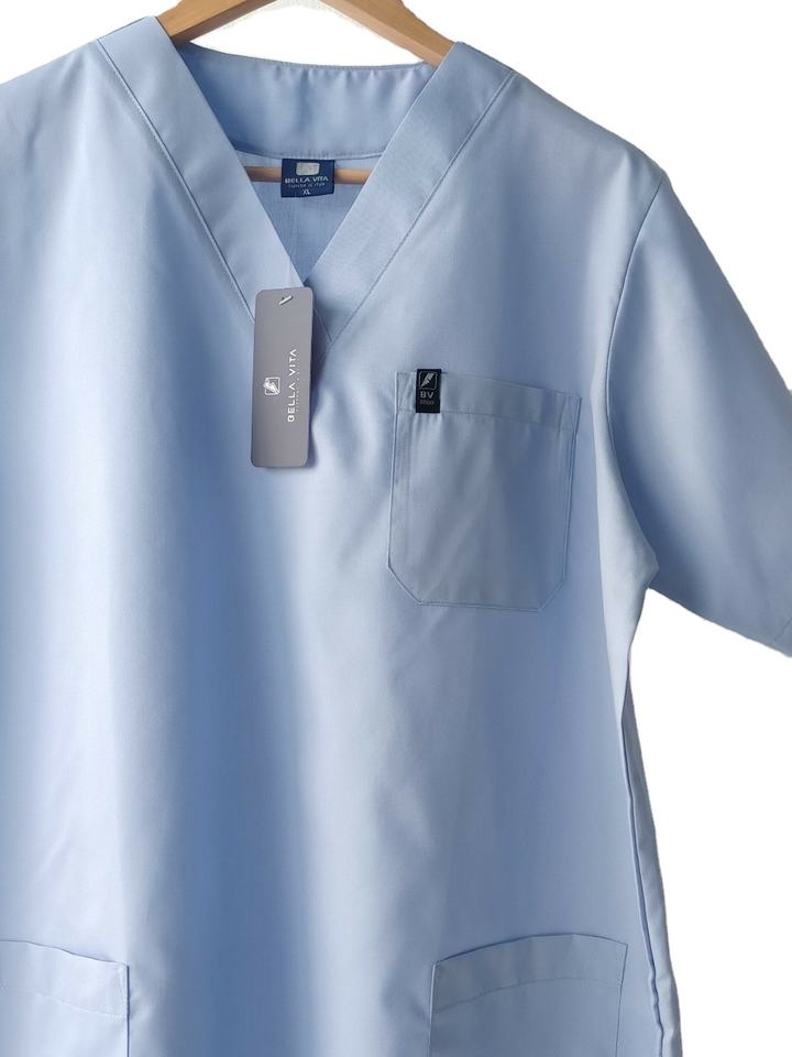 BELLA VITA V-Neck Blue Bright Breathable 65% Polyester 35% Cotton Unisex Short Sleeves Scrub Top 3 Practical Pockets Clinics