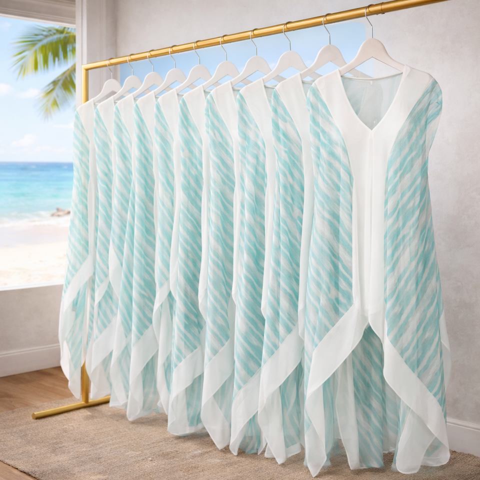 ชุดเดรสผ้าชีฟองพิมพ์ลายขอบกว้างคลุมชายหาดคอวีแบบลำลองพร้อมชุดเดรสเลเยอร์บางบานป้องกันไฟฟ้าสถิตย์