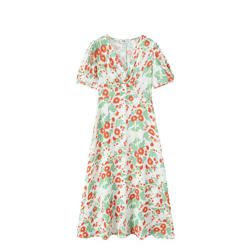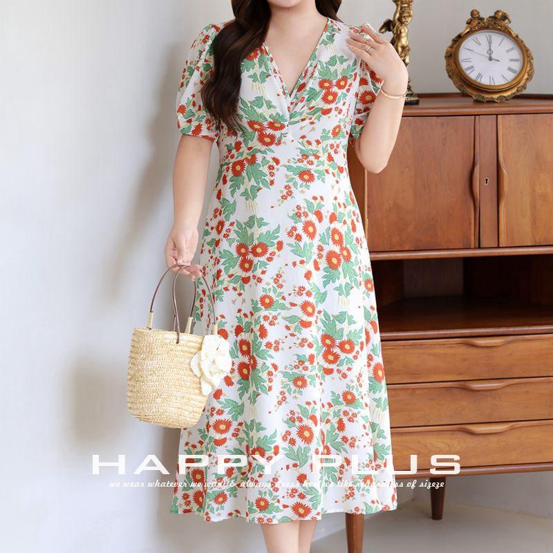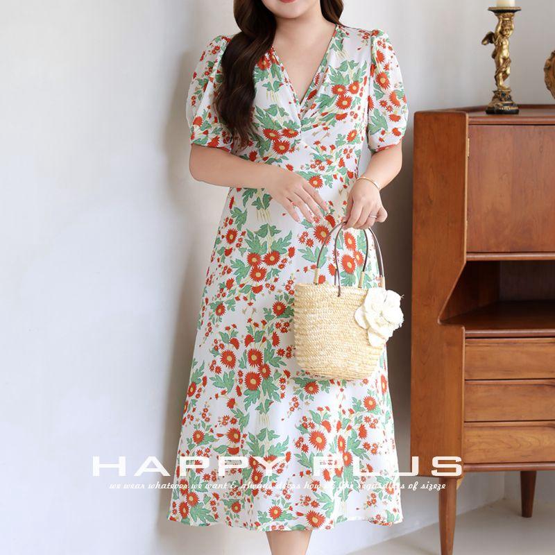 เดรสทรงเอพิมพ์ลายดอกไม้ คอวี สำหรับผู้หญิงไซส์พลัส เหมาะสำหรับงานเฉลิมฉลองวันหยุด สไตล์ลำลอง เอวทรงธรรมชาติ