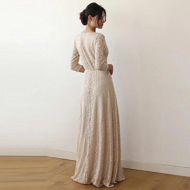 เดรสแขนสามส่วนลายลูกไม้วินเทจหรูหราคอวีสำหรับงานแต่งงานเจ้าสาว