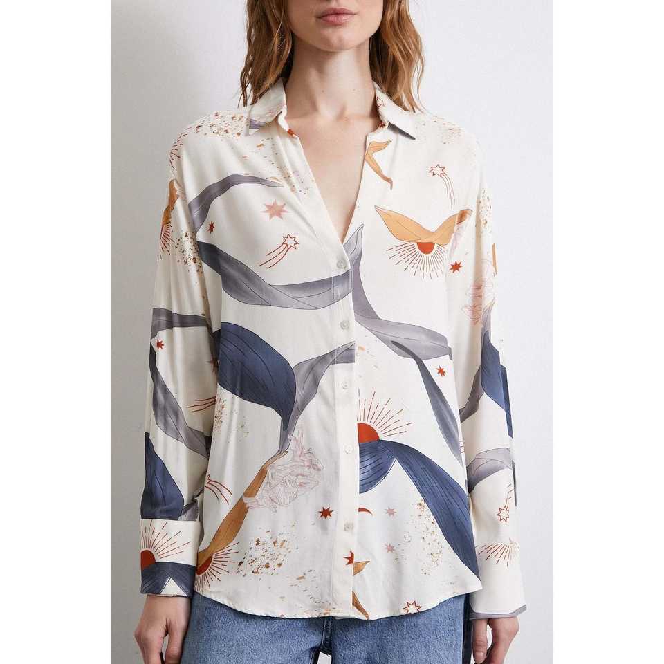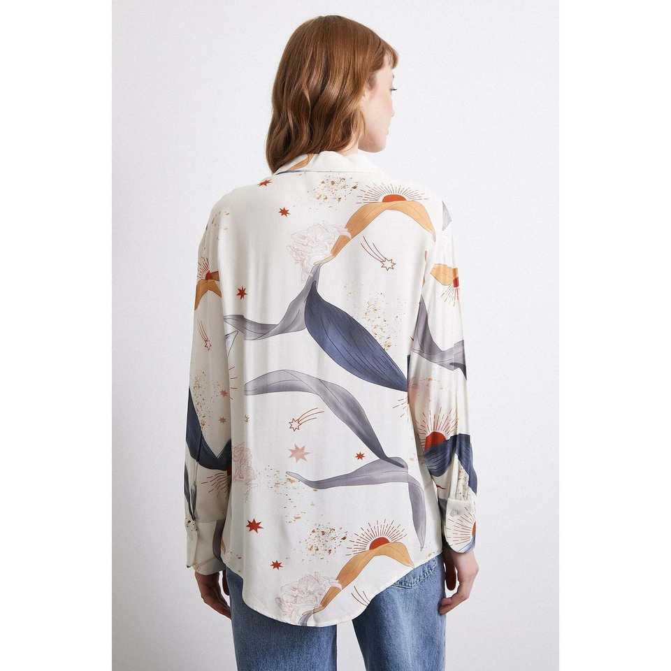 เสื้อชีฟองลายดอกไม้คอวีสำหรับผู้หญิง สีเอครู พิมพ์ลายดอกไม้ สไตล์ลำลอง ใส่ได้ทุกวัน ติดกระดุม