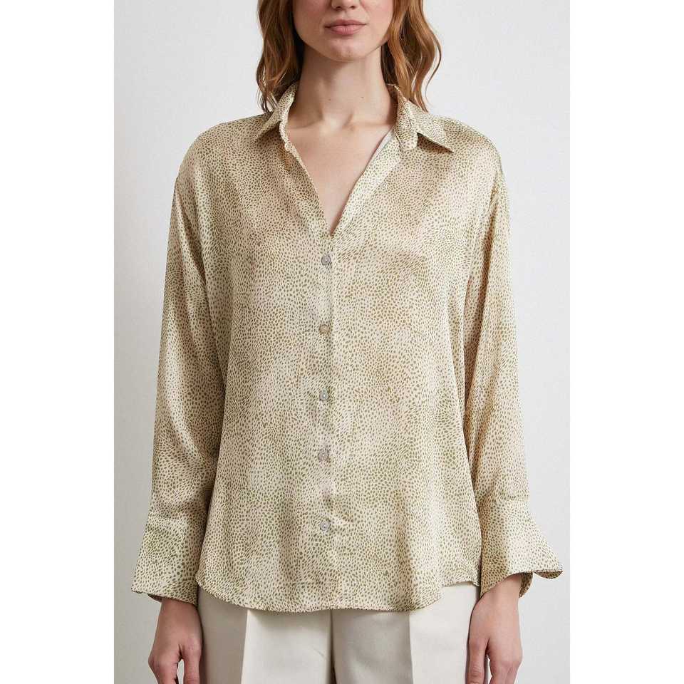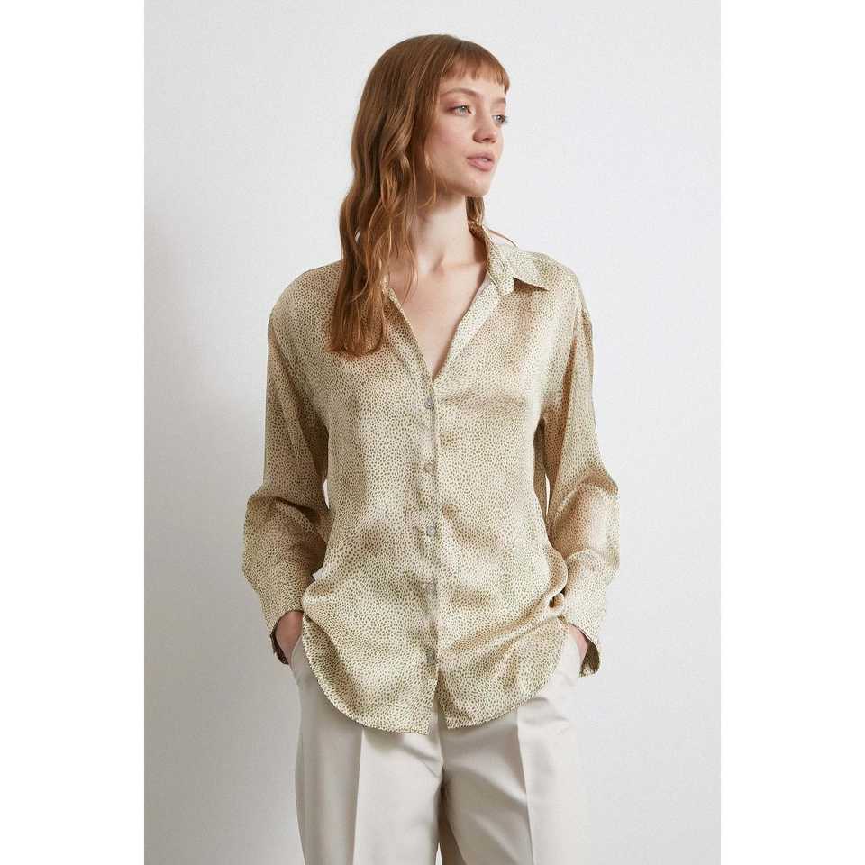 เสื้อเชิ้ตผ้าซาตินลายวีเนคสีเขียว เสื้อเชิ้ตผู้หญิงลำลองติดกระดุม สไตล์เรียบง่ายทุกวัน
