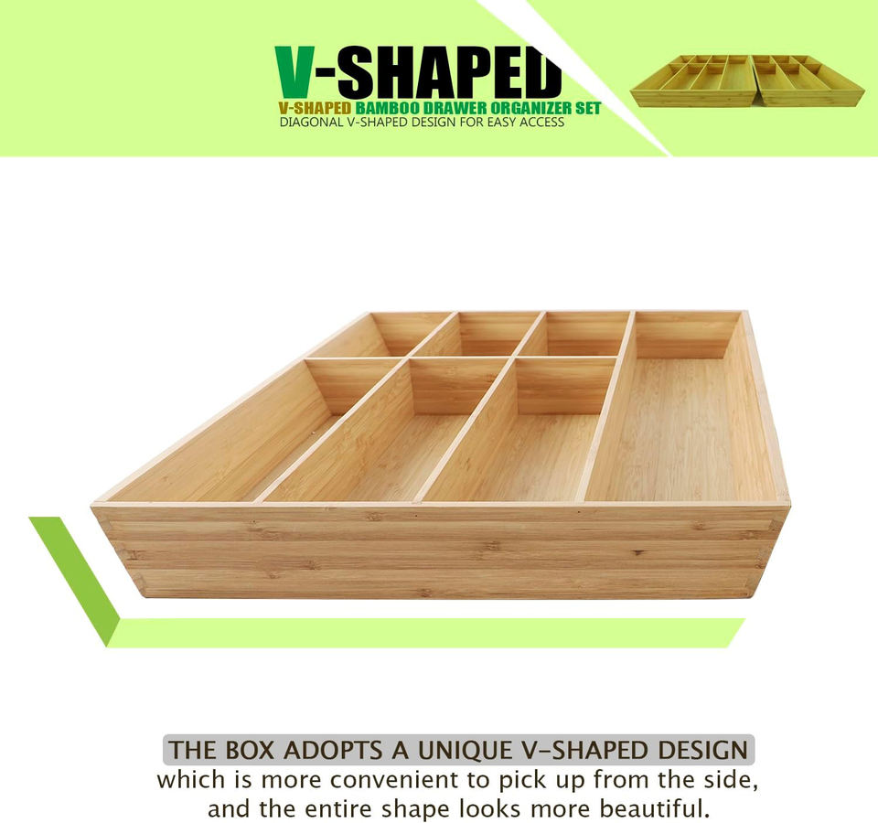 ที่จัดระเบียบลิ้นชักไม้ไผ่ขนาดใหญ่พิเศษ ทรงตัววี
