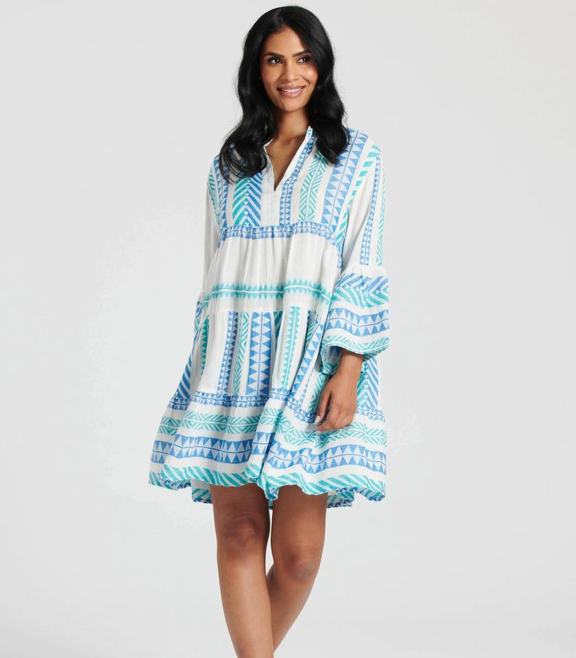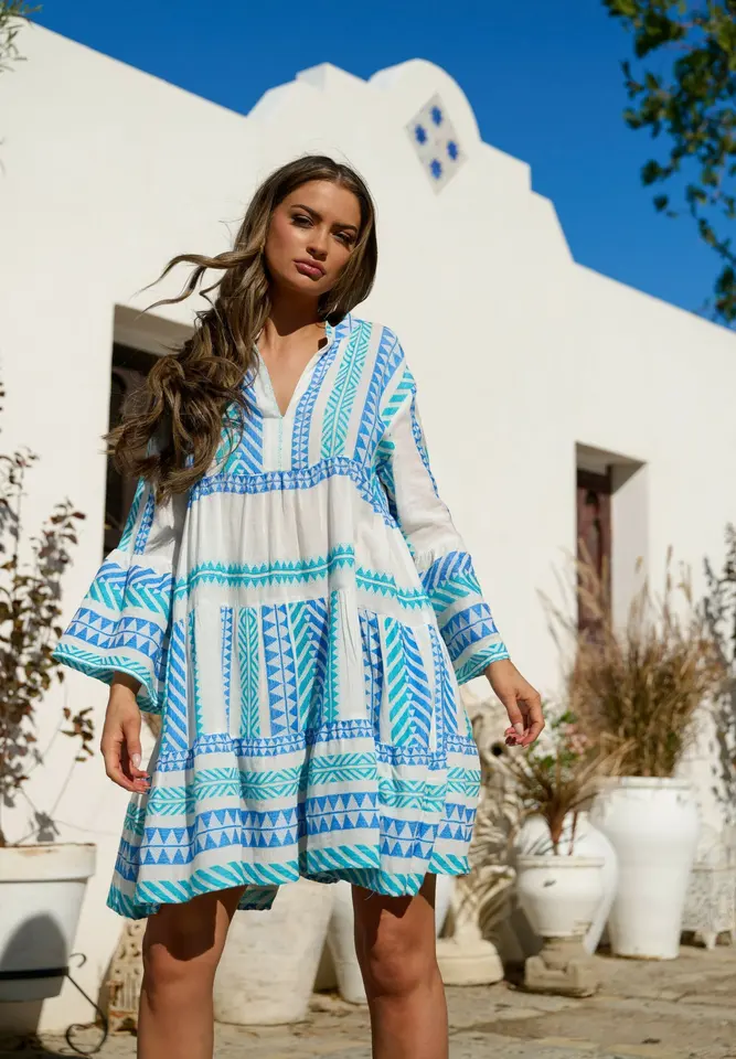 ชุดเดรสสั้นสำหรับผู้หญิงคอวีแขนยาวทรงกระดิ่งออกแบบได้ตามต้องการสำหรับผู้หญิงเนื้อผ้าทอตัว V ทำมือสไตล์อินเดียฤดูร้อน