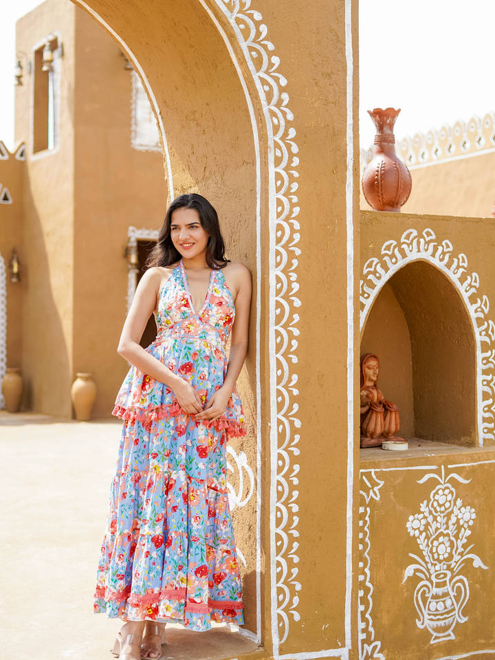 เดรสคอวีลายดอกไม้สไตล์โบฮีเมียน ความยาวปานกลาง แต่งระบายเป็นชั้นๆ เอวธรรมชาติ เหมาะสำหรับใส่เที่ยวพักผ่อนช่วงฤดูร้อน ชุดเดรสหรูหรา