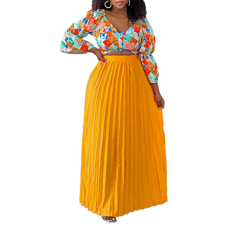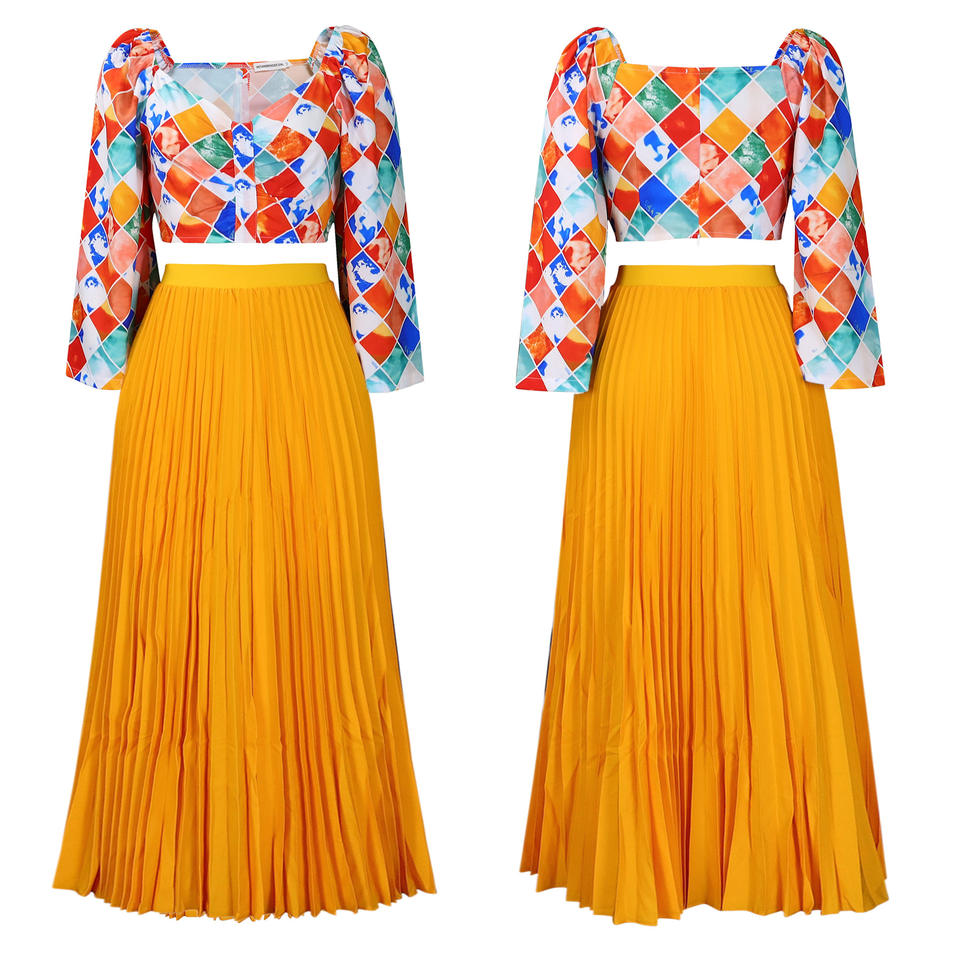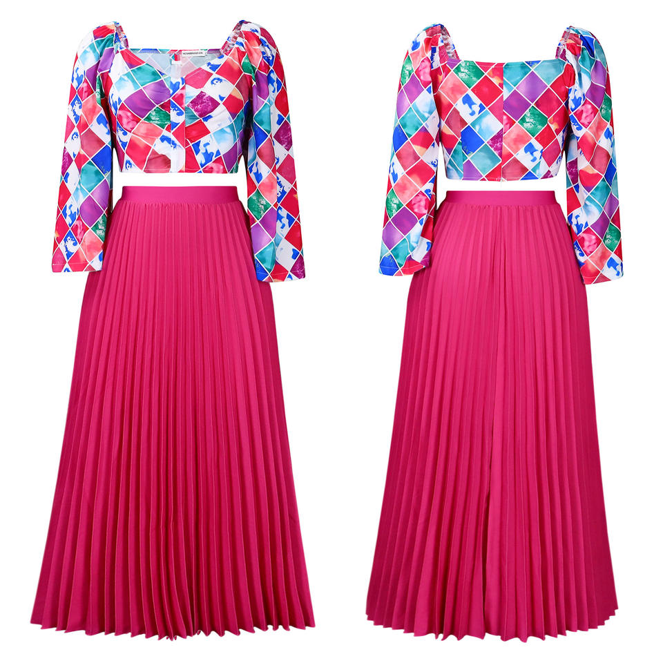 ชุดเซ็ต 2 ชิ้น เสื้อคอวีพิมพ์ลาย กระโปรงยาวจีบ สำหรับผู้หญิงแอฟริกัน แฟชั่น