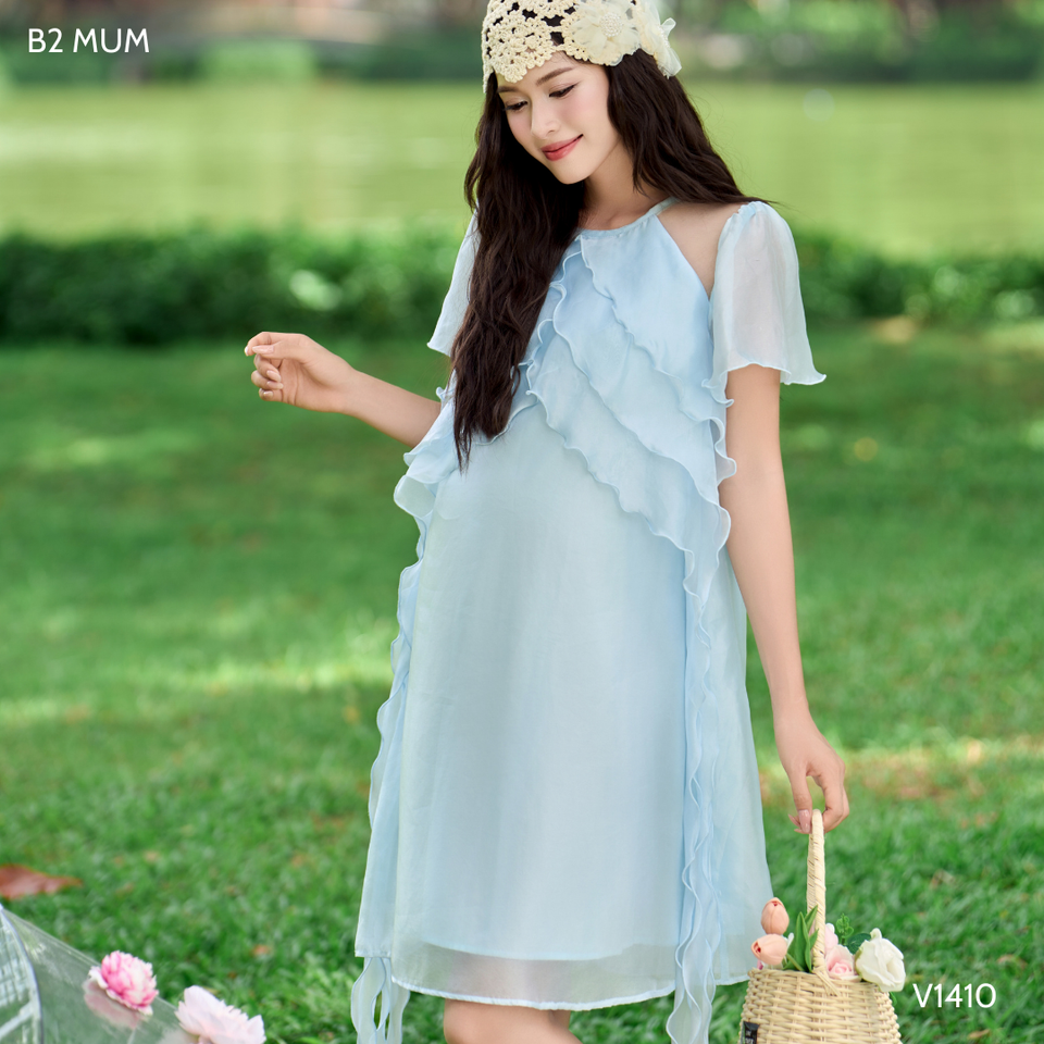 ชุดเดรสผ้าไหมแต่งระบายสีฟ้าสำหรับหญิงตั้งครรภ์, ชุดเดรสผ้าไหมประดับมุกดูดซับเหงื่อเนื้อผ้านุ่ม2ชั้นมีซิปด้านหลัง