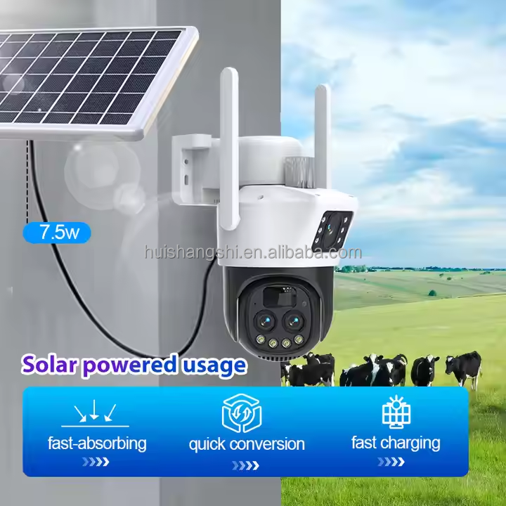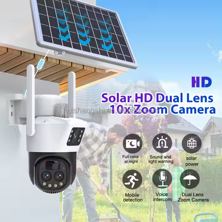 กล้องวงจรปิด V380 ซูม 10 เท่า รองรับซิม 4G แบบสองเลนส์ พลังงานแสงอาทิตย์ กล้องทรงกระบอกสำหรับภายนอกอาคาร สามเลนส์ PTZ ติดตามอัตโนมัติ ไร้สาย Wifi IP กล้องรักษาความปลอดภัย