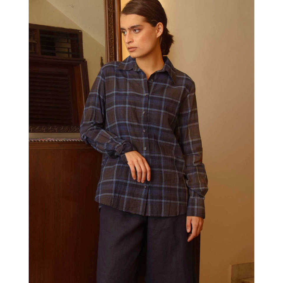 VAMIKA เสื้อเชิ้ตผ้าฝ้ายป๊อปลินลายตารางสีครามแฟชั่นเรียบง่าย