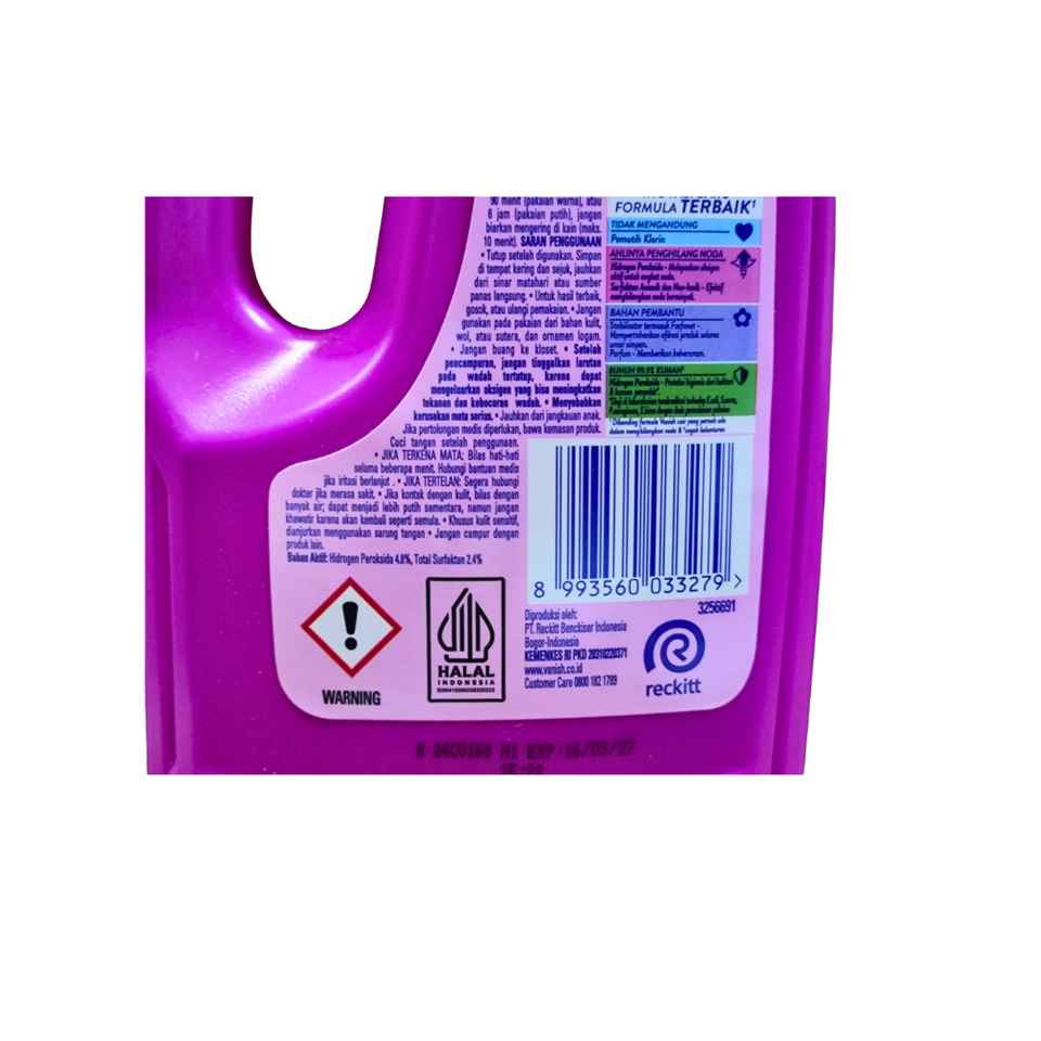 น้ำยาซักผ้าวานิช (อินโด) 500 มล. x 12 ขวด สีขาว ผลิตในสหราชอาณาจักร สารลดแรงตึงผิวประจุบวก 5-15% และน้ำหอม <5%