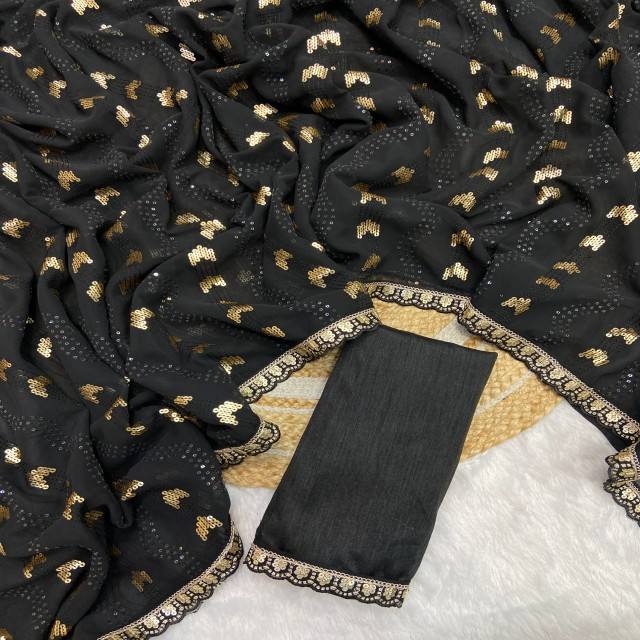 ผ้าส่าหรี VASTRA COTTAGE ดีไซน์บอลลีวูด สีดำ ทำจากผ้าจอร์เจตต์ ประดับด้วยลายปักเลื่อมสีทอง และขอบผ้าปักลายซารีแบบหนา