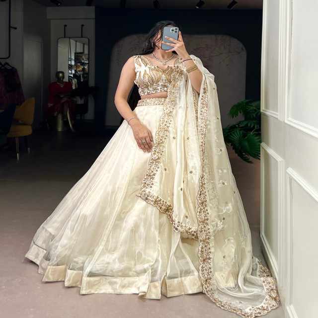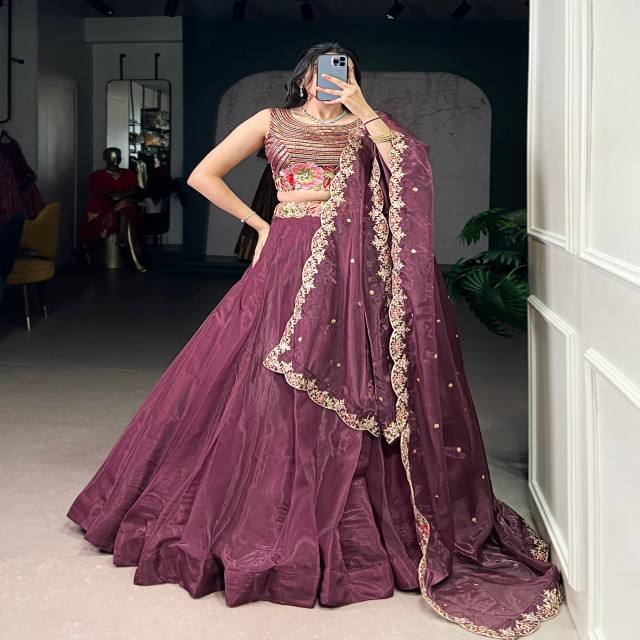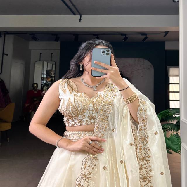 ชุดเลเฮนกาโชลีผ้าไหมชันดา วัสตรา คอทเทจ พร้อมงานปักด้วยด้ายเลื่อม ชุดเลเฮนกาเย็บสำเร็จพร้อมผ้าคลุมไหล่ ดีไซน์เนอร์แวร์